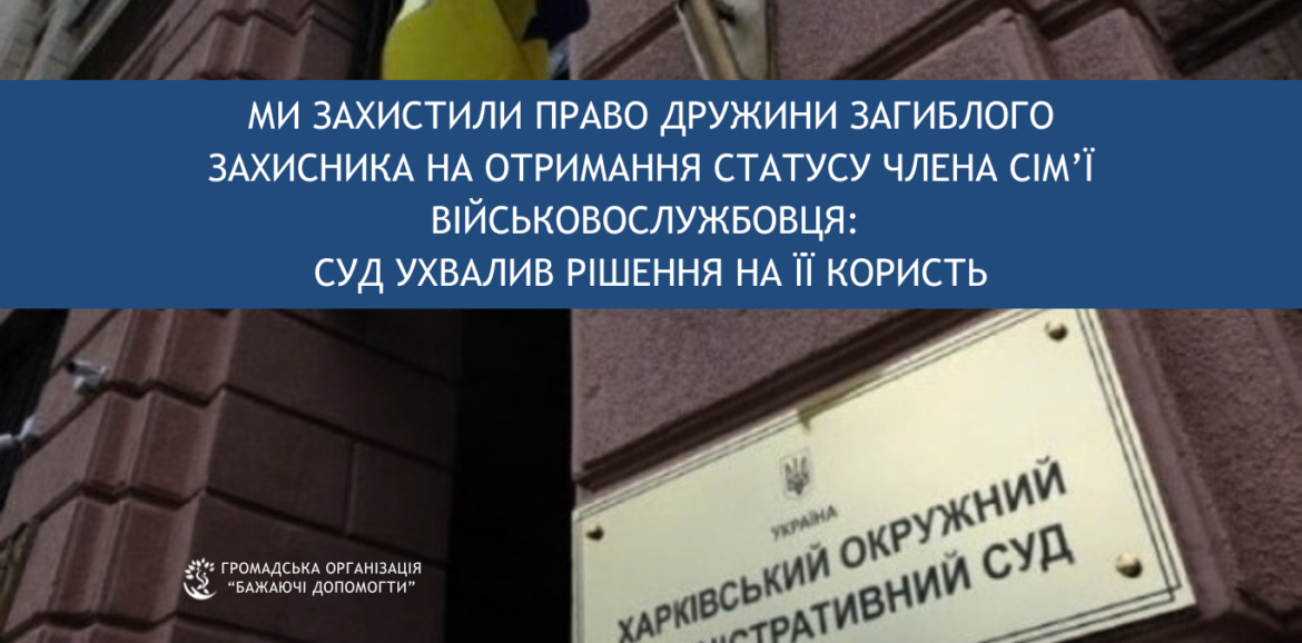 До громадської організації «Бажаючі допомогти» звернулася дружина загиблого військовослужбовця після того, як їй відмовили у встановленні статусу “Члена сім’ї військовослужбовця, який загинув (помер) чи пропав безвісти під час проходження військової служби”.